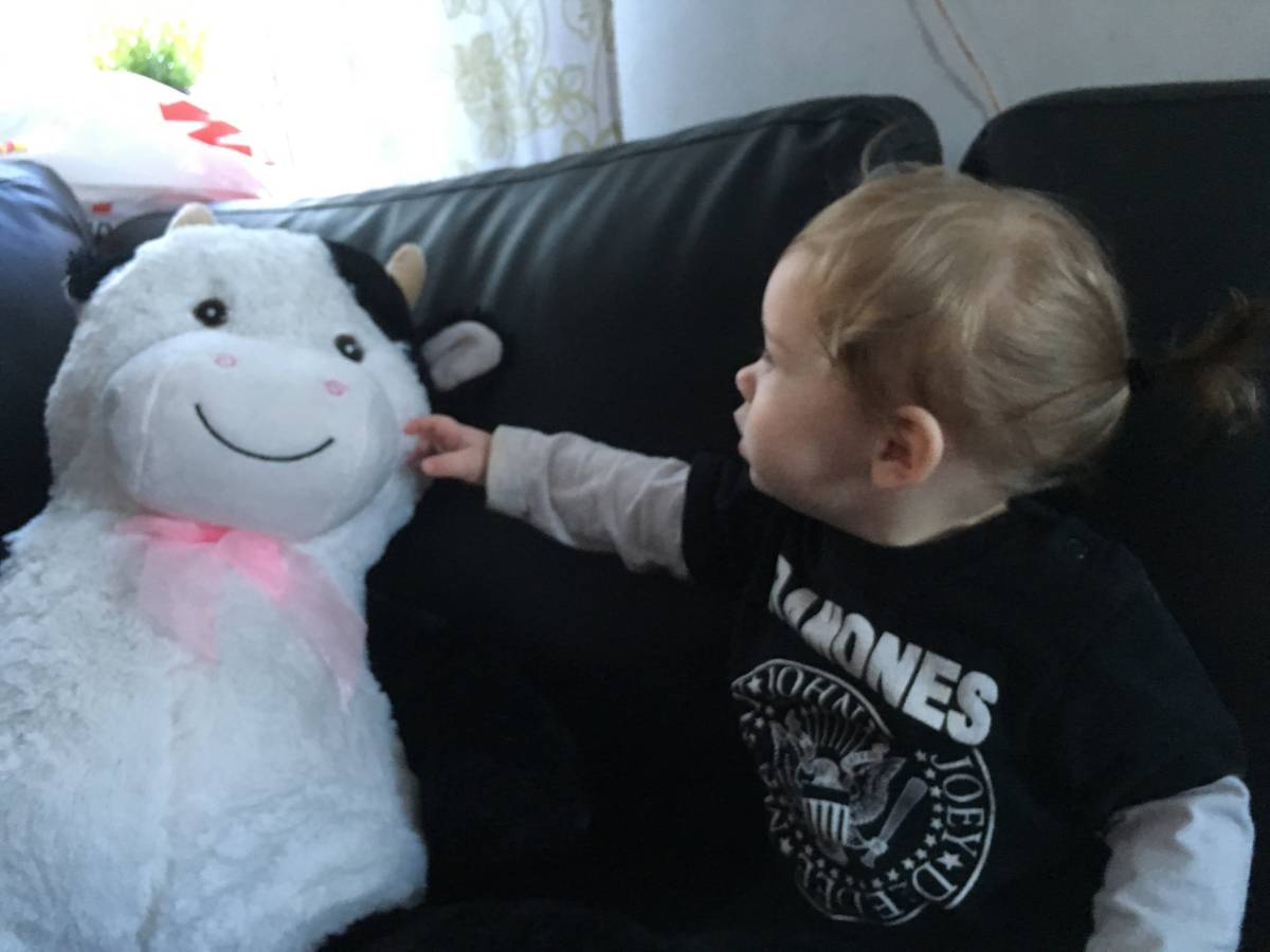Ikväll kom farmor och farfar på besök. De hade köpt en stor mjukis-ko till Nikki. Jättesöt och mjuk och Nikki började mysa rätt så omgående. Den är större än henne och jag tänker att den kommer ta katt-nisses plats i sängen.