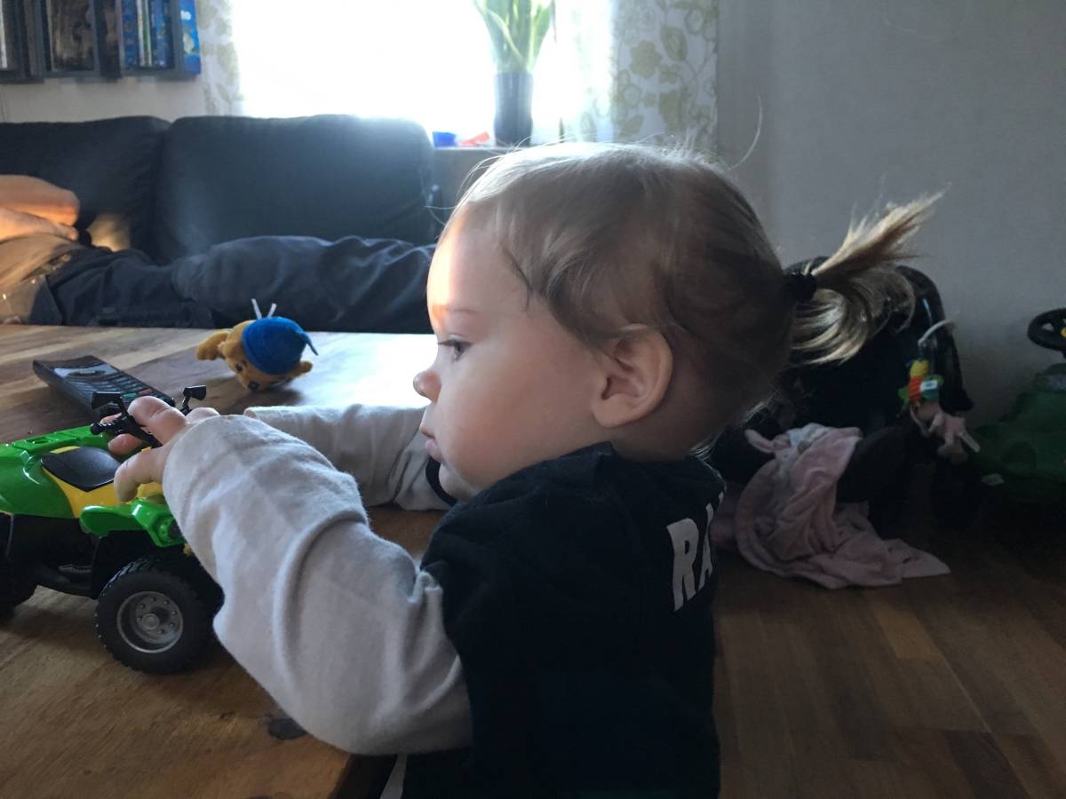 Sen kommer Jörgen. Farbror Jörgen. Jag håller på med nåt i köket, Morgan hjälper Rocky på ipaden, ”åh såg ni, hon tog ett steg.”