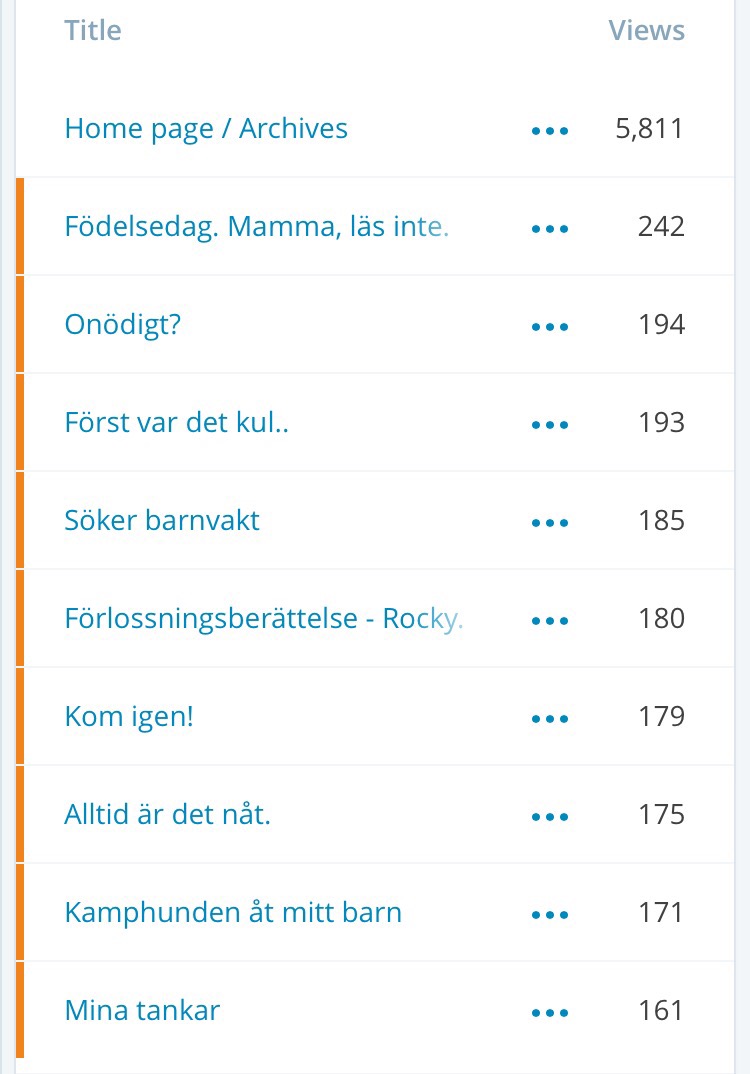 Här är de mest lästa inläggen och faktum är att nån läser en av förlossningsberättelserna varje dag. Det är ganska kul, och ännu roligare hade det ju varit om någon tagit sig tiden att kommentera också. Tycker själv att Rockys födelse är rätt kul. Sen har vi det där med rubriker, ”kamphunden åt mitt barn”, helt okul inlägg men det ville man visst läsa om. Och inlägget ”kom igen!”, det gjorde nån annan intressant.