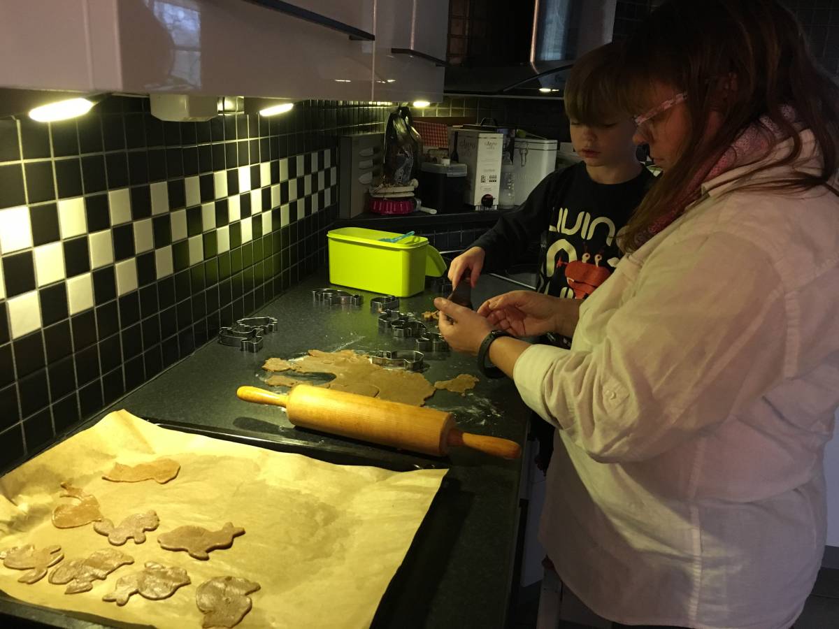 Rocky fick vattenfärg när vi var på Ikea sist, riktigt populärt och färgen han gillar mest är svart. Vet inte vad det säger egentligen.. Men det köper mig en massa tid när han sitter där och målar, och jag hann både med att dammsuga och starta en maskin tvätt. Mamman hörde av sig mitt i allt och ville baka pepparkakor, vilken superide! Jag som blev så förbannat trött på skiten sist och var på väg att slänga ut alltihop genom fönstret, blev riktigt glad för lite moraliskt stöd. Och det var nog tur att hon var här, för jag var fortfarande inte vän med varken deg eller jävla kavel, fan det bara fastnar, och sen när jag skulle plocka upp skiten gick det bara sönder. ”-Här! Nu får du göra lite!” Jag tog istället över ansvaret för ugnen men inte ens det kunde jag klara av, pepparkakorna är brunare än dom stackars Afrika-barnen på reklamen. Rockys intresse för kakor höll i sig i ungefär 2 minuter men gräva i mjölburken kunde han göra i en hel timme.