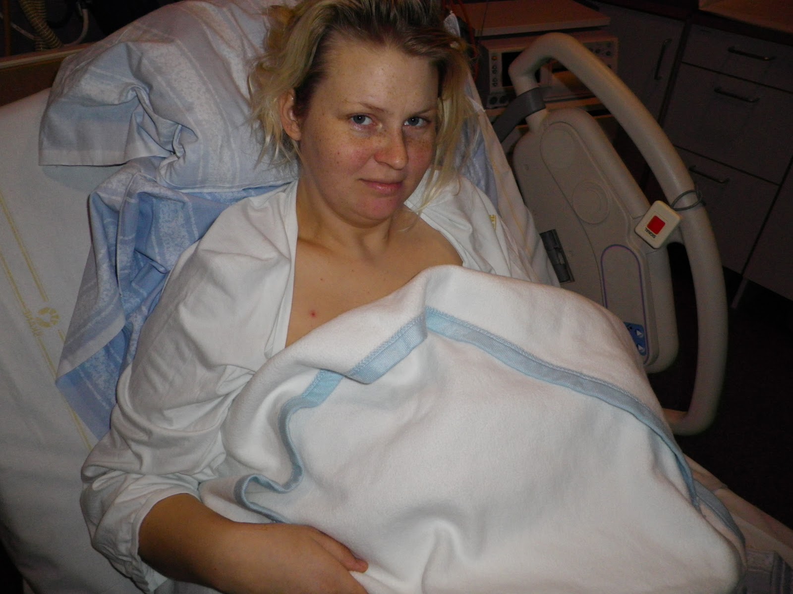 Nu går det ganska bra, Morgan har berättat att jag snarkade, vaknade, sög i mig lustgasen, och somnade igen. Får proteindrinkar och glass, dom fattade nog hur slut jag var när jag sov mellan SD. Här är allt en dimma men jag kommer ihåg att det var ett väldigt starkt tryck neråt och jag var orolig att BM inte skulle vara där när bebisen kom och frågade Morgan efter varje SD, ”Är hon här?”