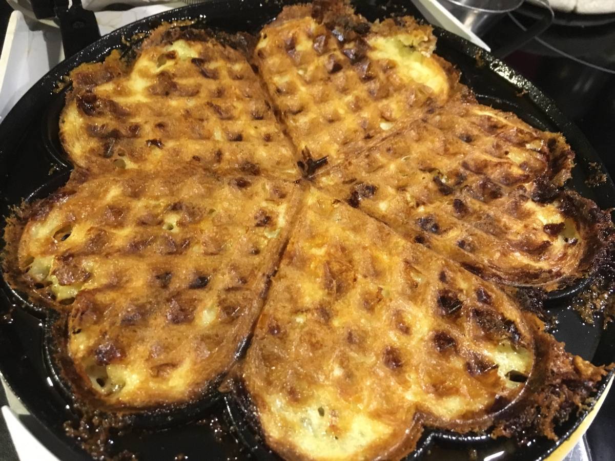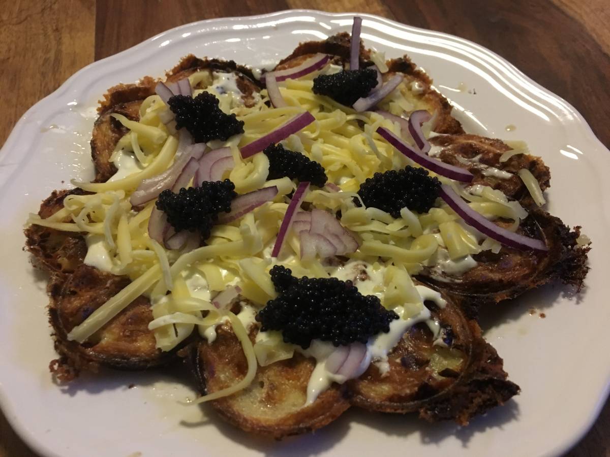 När det jäst färdigt delar du upp bitarna, i ursprungsreceptet står det 16 bitar men jag tyckte det blev tapas av det hela då. 10 bitar var lagom som plattas ut så gått det går, lägg på bakplåtspapper à la pizzeria och jäs där i 10 minuter till. Starta fritösen och sätt temperaturen på 180 grader, och börja plocka fram dina tillbehör. Jag använde créme fraiche, blanda i vitlök, (glöm för helvete inte vitlök!) riven ost, finhackad rödlök och svart kaviar.